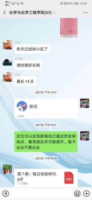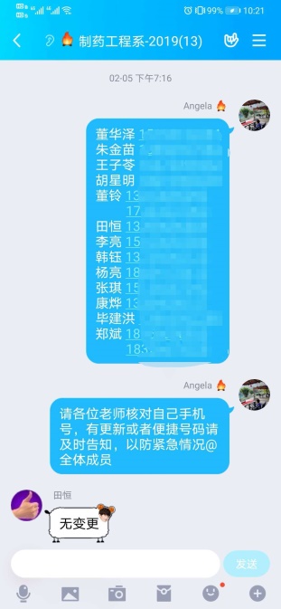 防紧急情况发生,及时更新所有成员联系方式,并将所有联系方式进行群内公开,要求教师提供紧急联系人和备用联系号码,以求通知能够按时及时准确传达到每个人。同时积极查阅各类新闻,查看各种对疫情具有预防作用的小程序,分享疫情区域小程序,并及时提醒老师尽量减少出门,一定要出去也要避开疫情所在区域,避免疫情的扩散和传播。