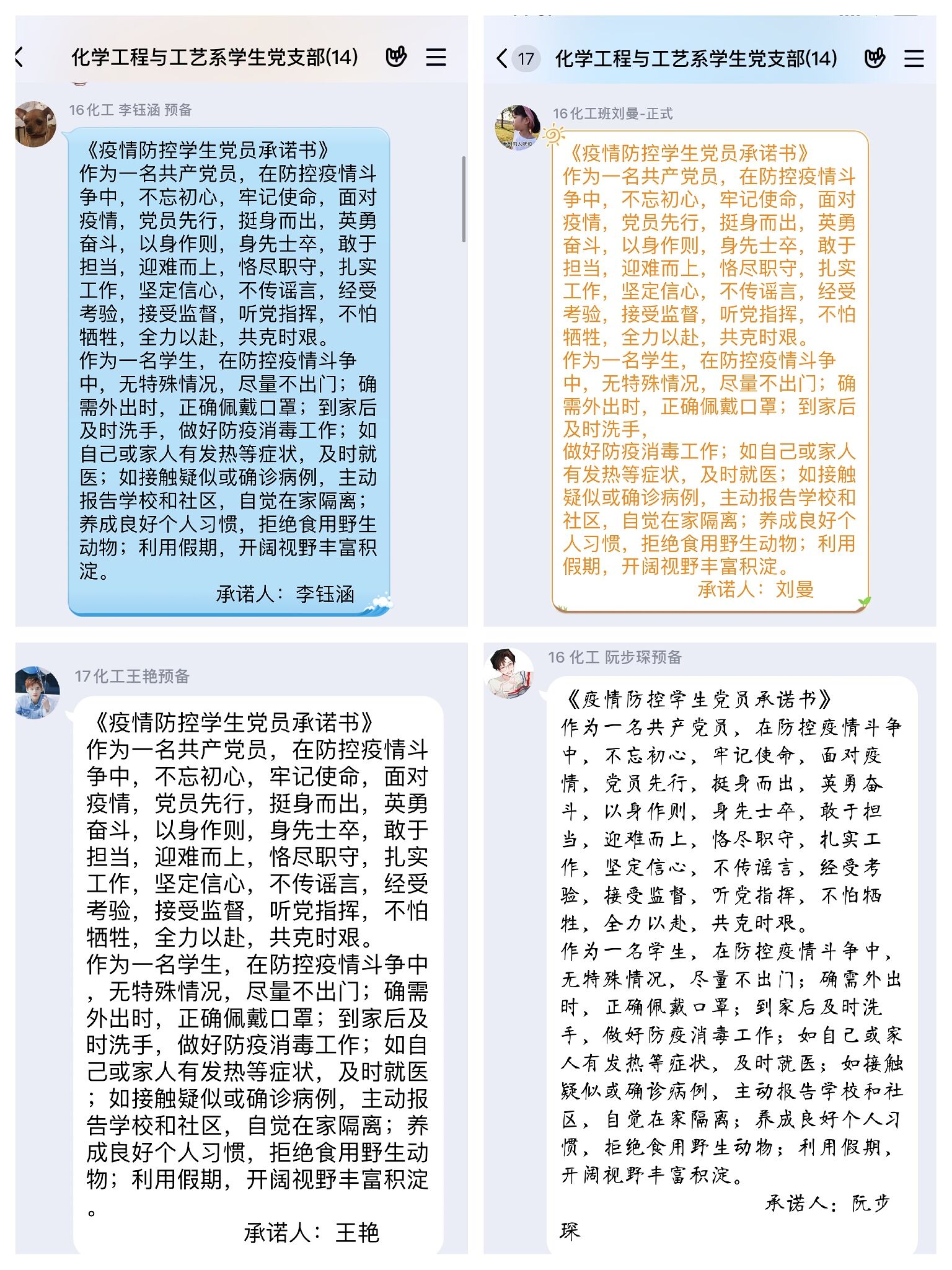 化学工程与工艺系员工党支部的入党积极分子刘筱璇、章佳萍和黄嘉琦看到战斗在一线的基层干部和身着防护服的最美逆行者时,她们被他人的事迹感动,决定也投身抗击疫情的活动中,相约加入圆梦公益活动,成为一名网上防疫宣传志愿者。