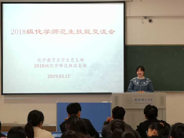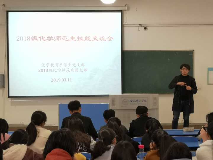 3月11日下午,化学教育系员工党支部主办、2018级化学师范班团支部承办化学与化学工程学院师范生技能交流会。2018级化学师范班全体员工参加此次交流会,会议由班主任王庆林主持。