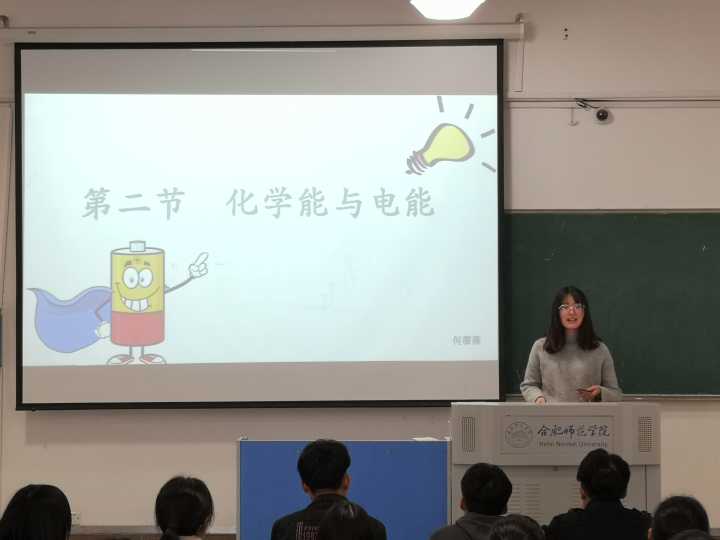 中科大附中优秀实习生、2016级化学师范班何薇薇同学为同学们展示无生上课。她先详细讲解了教案的书写格式并强调无生上课在教团队格面试的重要地位,后以“化学能与电能”课题展示无生上课的重要内容。她的精彩展示让同学们对于无生上课有了更深刻的了解与认识。
