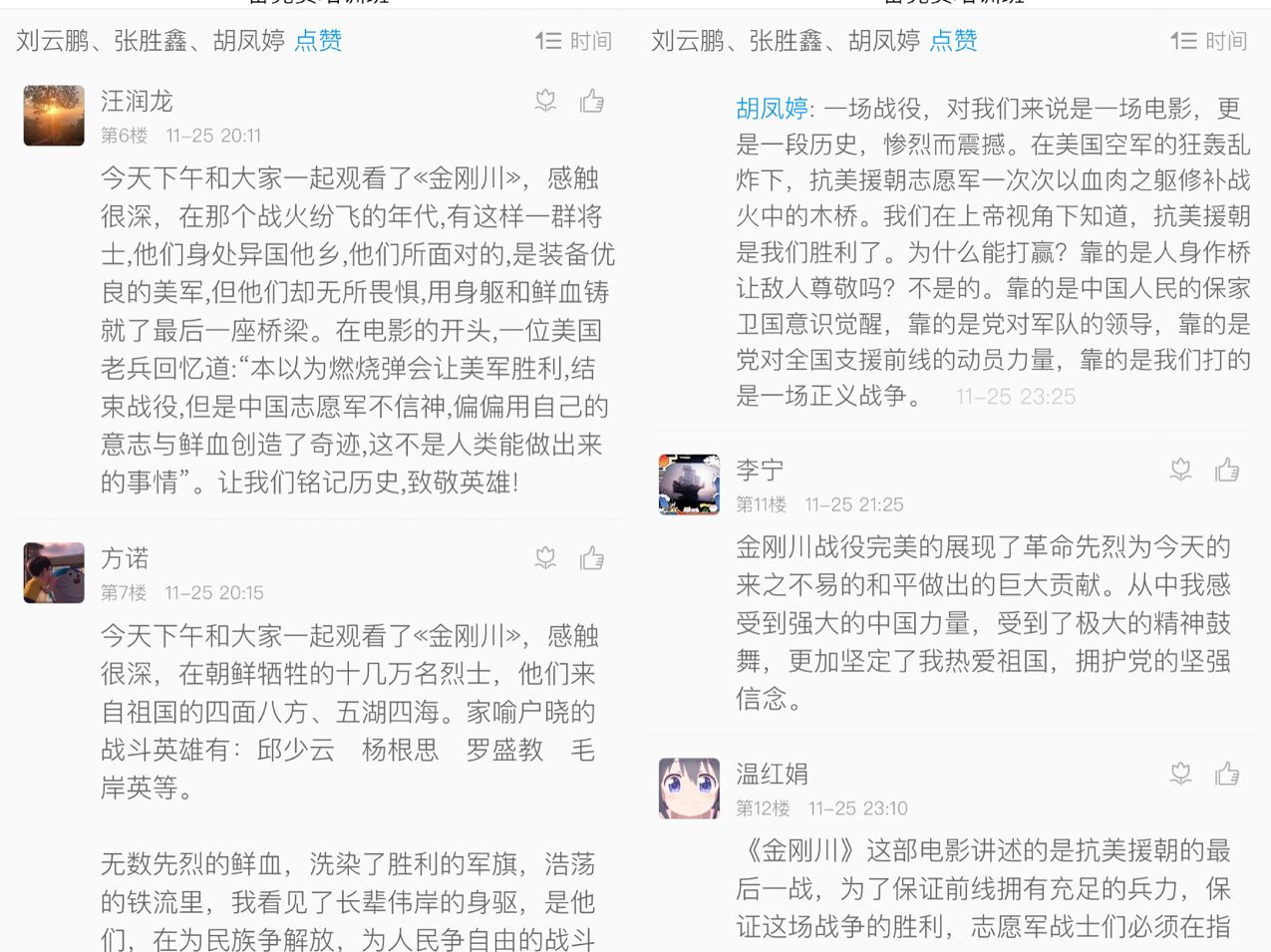 观影结束后,学员们在学习通里展开交流讨论。发展对象李宁表示,金刚川战役完美的展现了革命先烈为了今天来之不易的和平做出的巨大贡献,从中她感受到了强大的中国力量,受到了极大的精神鼓舞,更加坚定了热爱祖国、拥护中国共产党的信念。预备党员吴长纲说:“在看到志愿军全程被打击的时候我心里太憋屈,一方面真心希望那样的惨烈不再发生,另一方面感恩并缅怀我们最可爱的人。今天我们每个中国人作为那场战役的既得利益者,在享受着先烈们带来的安宁的同时,我们更应该珍惜和平,勿忘历史,传承精神。”(化学与化学工程学院:翟媛媛)