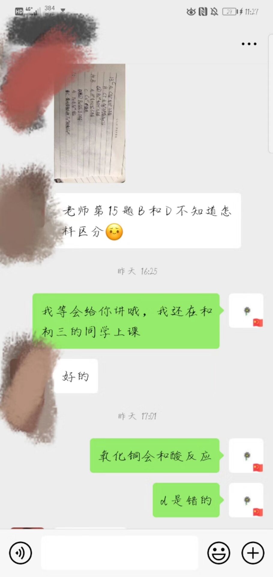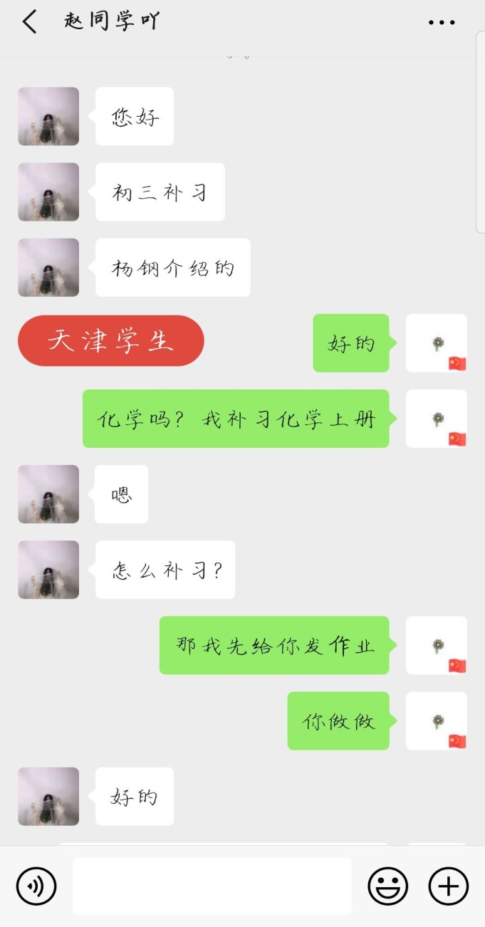 2月3日她将为员工免费辅导化学这一信息通过微信朋友圈发出。很快便有来自四川、北京、河北的员工报名,课程范畴涵盖了初三、高一到高三。为了更好的方便教学,她建立了教学辅导微信群。通过视频,每天进行两小时真题讲解和试题分析,帮助员工复习。她在教学的过程中,以认真、负责、真诚的态度和耐心,有效的促进了员工学科知识的提升,他们不仅是师生,也成为了好朋友。