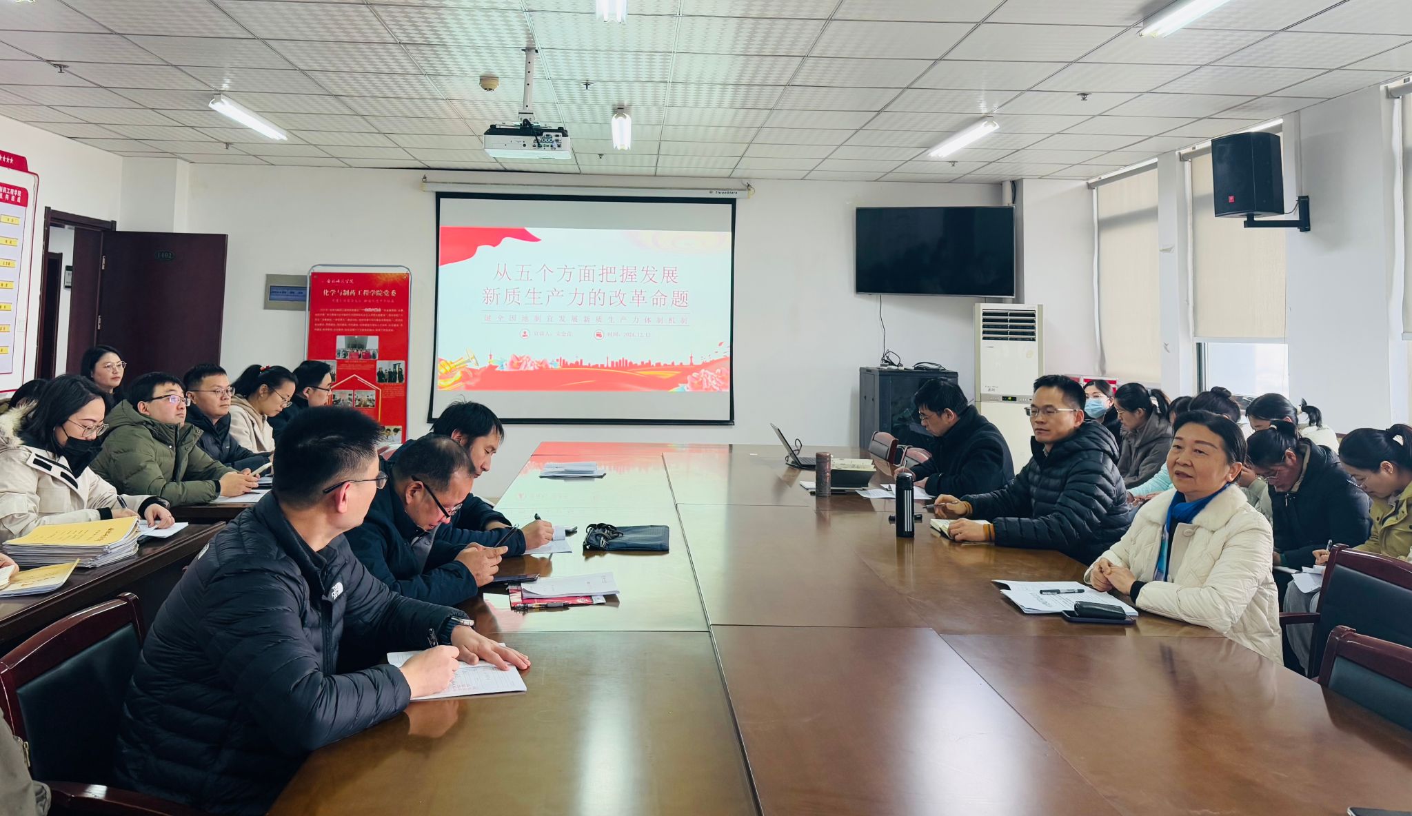 为深入学习贯彻党的二十届三中全会精神,凝心聚力推动学院高质量发展,12月13日,化学与制药工程公司党委副书记、经理朱金苗在行知楼1402为全体教职工作题为《从五个方面把握发展新质生产力的改革命题》的宣讲报告,会议由党委书记李红主持。
