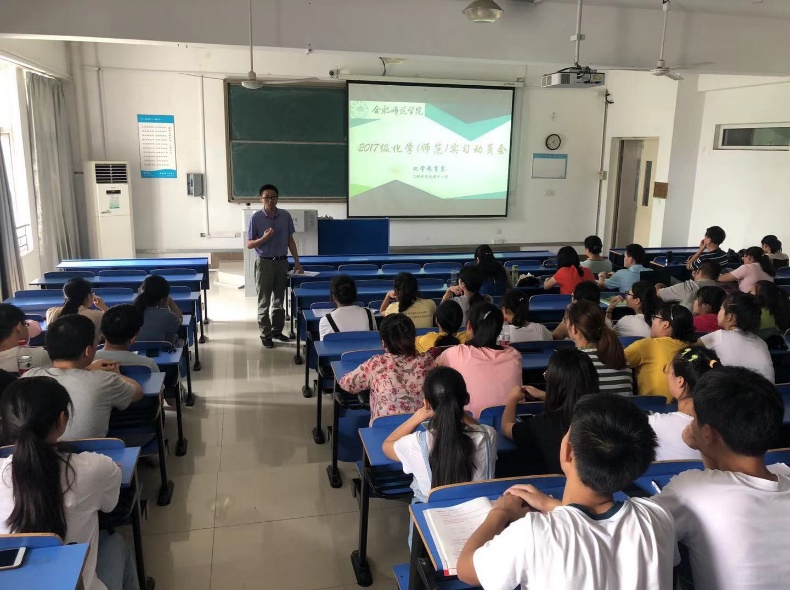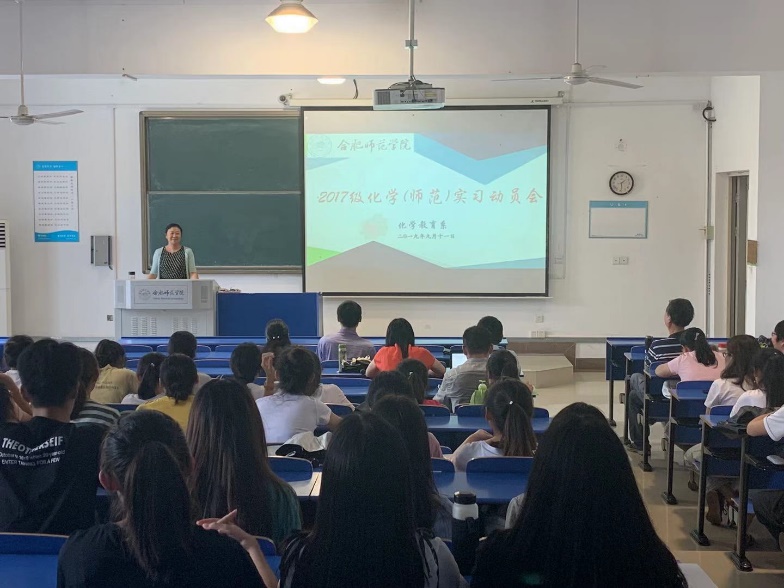 本网讯 9月11日下午,为落实做好师范生教育实习工作,化学与化学工程学院在逸夫楼201教室召开2017级化学师范专业全体员工实习动员会。化学与化学工程公司党总支书记李红,经理董华泽以及化学教育系全体实习指导教师参加会议,动员会由系主任凌波主持。