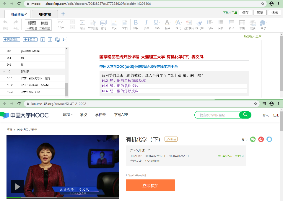 为了支持新冠肺炎疫情防控期间的高校在线教学,教育部和中国大学MOOC(慕课)平台公开了精心建设的各级各类MOOC资源,供广大教师准备网课时使用。我秉承以适用为原则,选择了大连理工大学姜文凤教授负责的国家精品课程《有机化学(上、下)》作为在线课程资源,并结合课程要求实施翻转课堂教学。