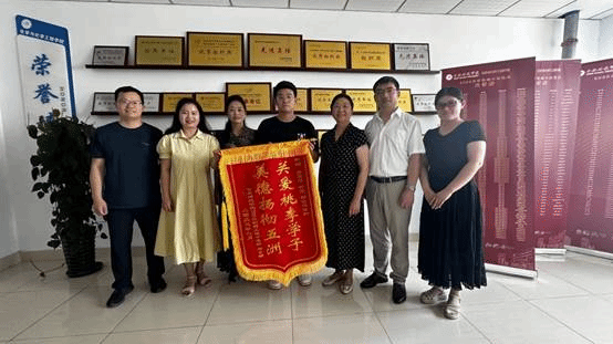 本网讯 6月20日下午,tyc8722太阳集团2023届制药工程中爱合作专业毕业生,现已被中国药科大学录取为硕士研究生的马士腾同学和她的母亲,将写有“关爱桃李学子、美德扬彻五洲“的锦旗送到了学院,公司党委书记李红、副经理董雄辎、制药工程系主任郑斌等热情接待了员工及家长。