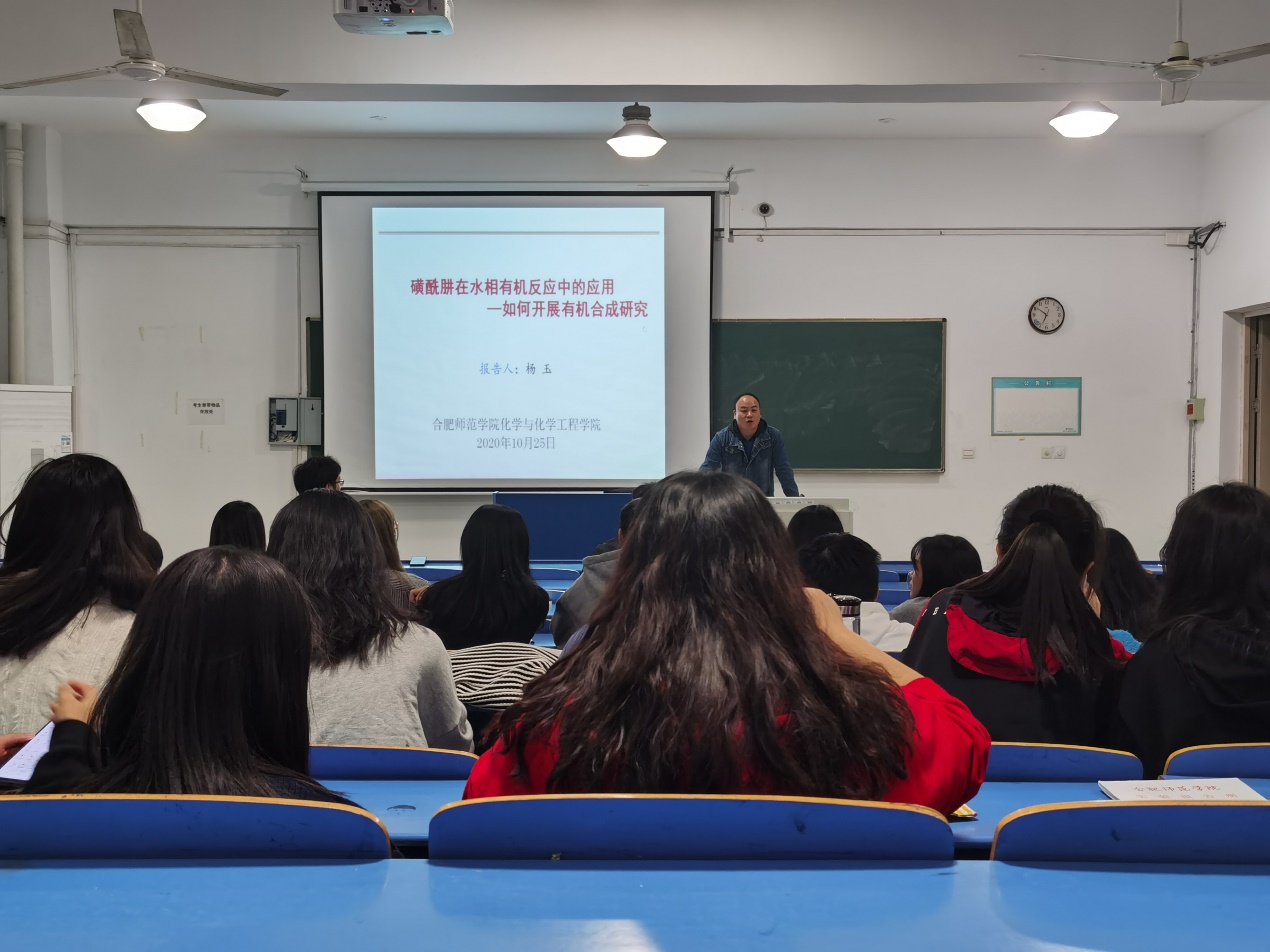 本网讯 2020年10月25日,药物制剂教研室杨玉博士为2020级制药工程、药物制剂全体员工做专题为“磺酰肼在水相有机反应中的应用”的学术报告,报告由药物制剂陈虎副教授主持。