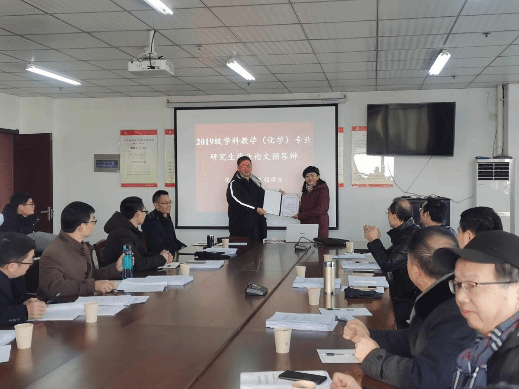 会议伊始,化学与化学工程学院经理董华泽教授对各位校外导师的到来表示欢迎与感谢,而后进行了校外新增导师聘书的颁发仪式,聘书由姚如富教授颁发。接着姚如富教授阐述了预答辩的目的和要求,强调了员工在答辩过程中应着重阐研究过程、研究方法、研究结论及创新点等。