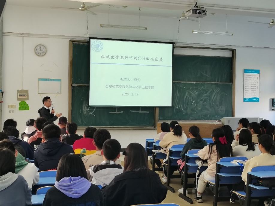 本网讯 2020年11月12日下午,制药工程系李亮博士在博约楼109教室作专题为“机械化学条件下的C-H活化反应”学术报告,2020级制药工程专业全体员工参加学术报告会。