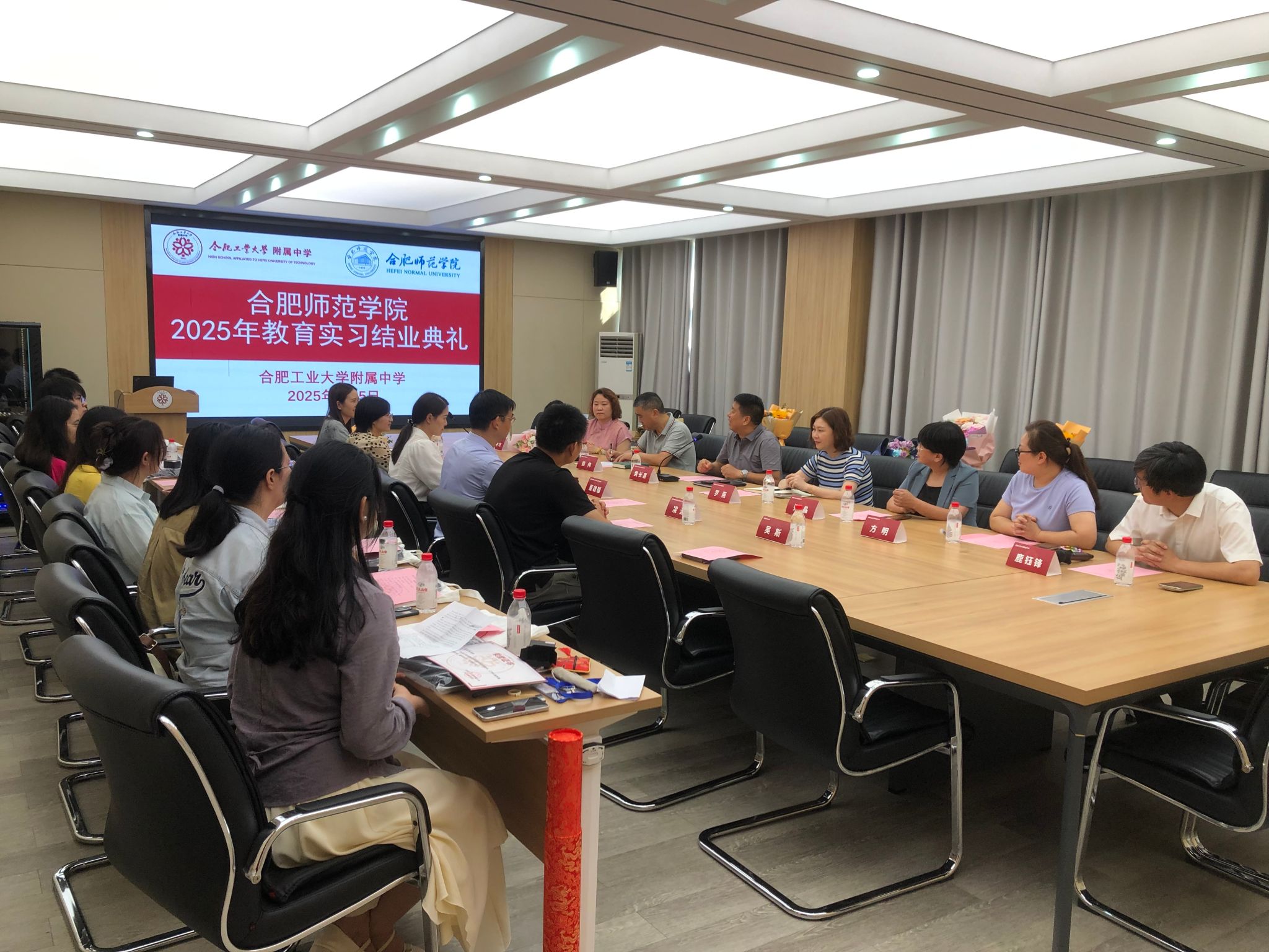 罗燕代表合工大附中致辞,高度肯定了实习成效,并寄语实习生坚守教育初心。沈瑞芮宣读了聘任实习指导教师文件,并为指导教师发放聘书。工大附中化学学科组组长方明老师宣读了优秀实习生名单。谢世丽汇报了九位同学本学期的实习情况,同时也对各位指导老师的关心和指导表示感谢。指导教师代表赵园青从教学相长视角,讲述了指导与被指导的双向奔赴。董雄辎对化学实习生的表现给予肯定,同时也对附中为公司教育实习提供的良好平台表示感谢,希望双方在合作共建中形成育人合力,持续为基础教育事业输送新生力量。黄长喜聚焦校际合作,回顾过往合作成果,展望未来在课程研发、团队互培、实践基地共建等方面的新路径,期待双方持续携手,书写更具深度与广度的教育合作新篇章。