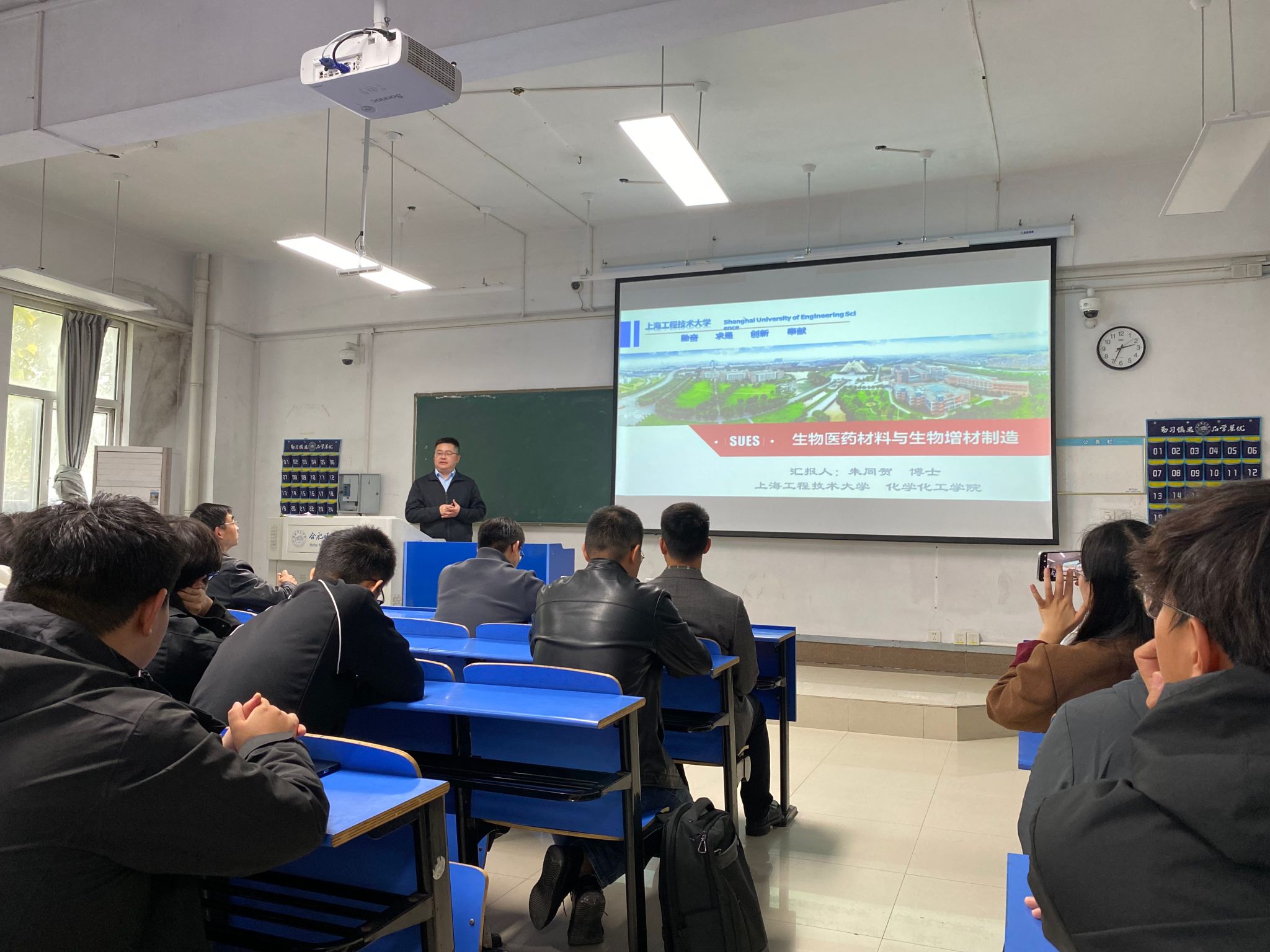 本网讯 10月31日下午,tyc8722太阳集团2012届优秀员工、上海工程技术大学教授朱同贺应邀返回母校,在锦绣校区逸夫楼A103为以tyc8722太阳集团师生为主的全校师生作了题为“生物医药材料与生物增材制造”的讲座。讲座由tyc8722太阳集团经理朱金苗主持,学院副经理董雄辎、教师代表及相关专业员工参加。