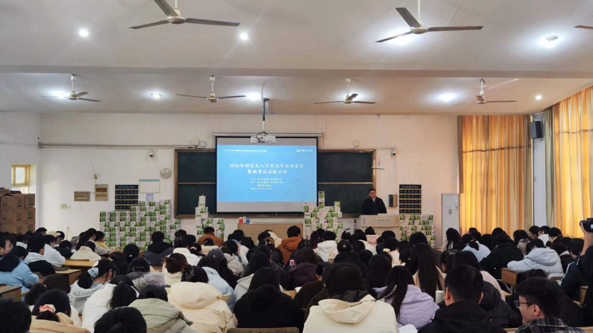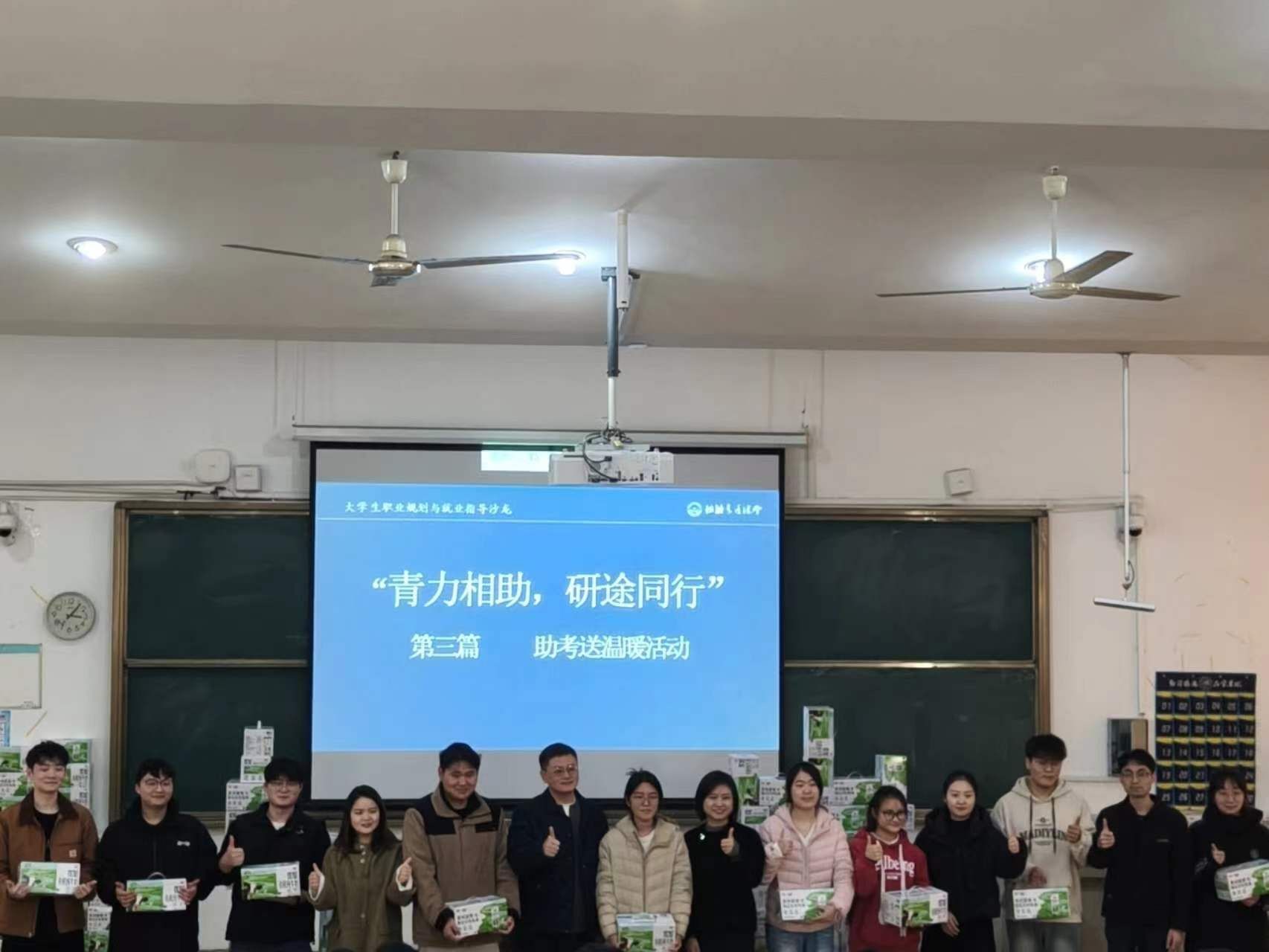 各毕业班辅导员结合自身经验和所带员工的具体情况,进行了细致入微的考前指导。他们从考前作息调整、答题技巧、考场心态、物品准备等多个方面给予了实用建议,叮嘱同学们在最后冲刺阶段要回归基础、保持手感,更要相信自己长期以来的努力与积累。辅导员们语重心长的叮嘱和关怀,让在场学子倍感温暖与鼓舞。动员环节结束后,活动现场进入了温馨的“送温暖”环节。学院领导与老师们一同将精心准备的“助考加油包”——代表健康与关怀的暖心牛奶,送到每一位考研学子手中。一盒盒牛奶,承载的是学院对学子们身体健康的关切,更是“一杯奶,一份情,一股劲”的深切寓意,希望同学们补充营养,精力充沛地完成最后的冲刺。